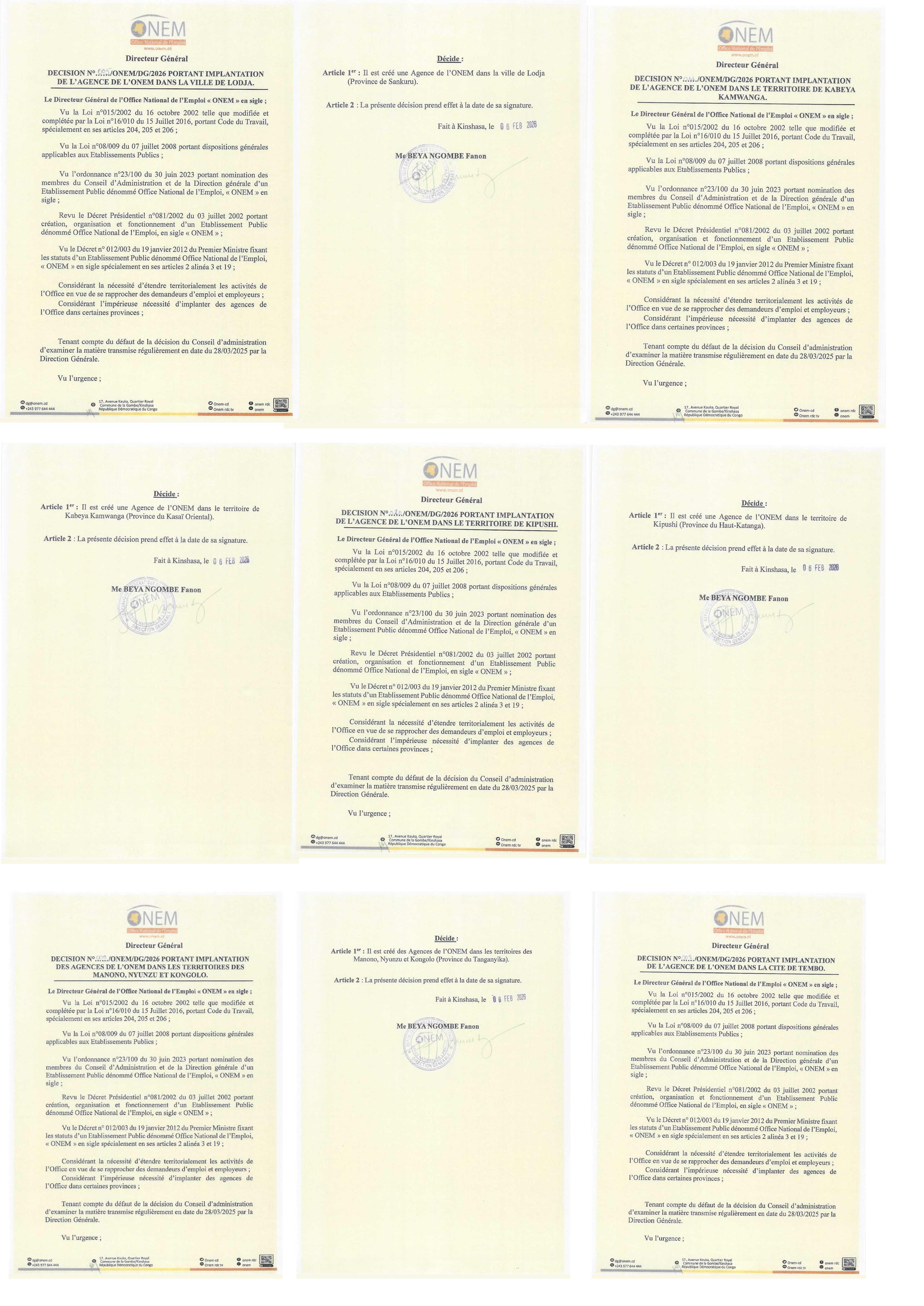 RDC : l’ONEM renforce sa présence en provinces avec de nouvelles agences