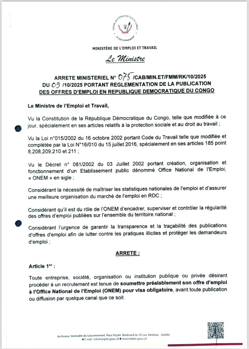 RDC : un arrêté ministériel encadre désormais la publication des offres d’emploi